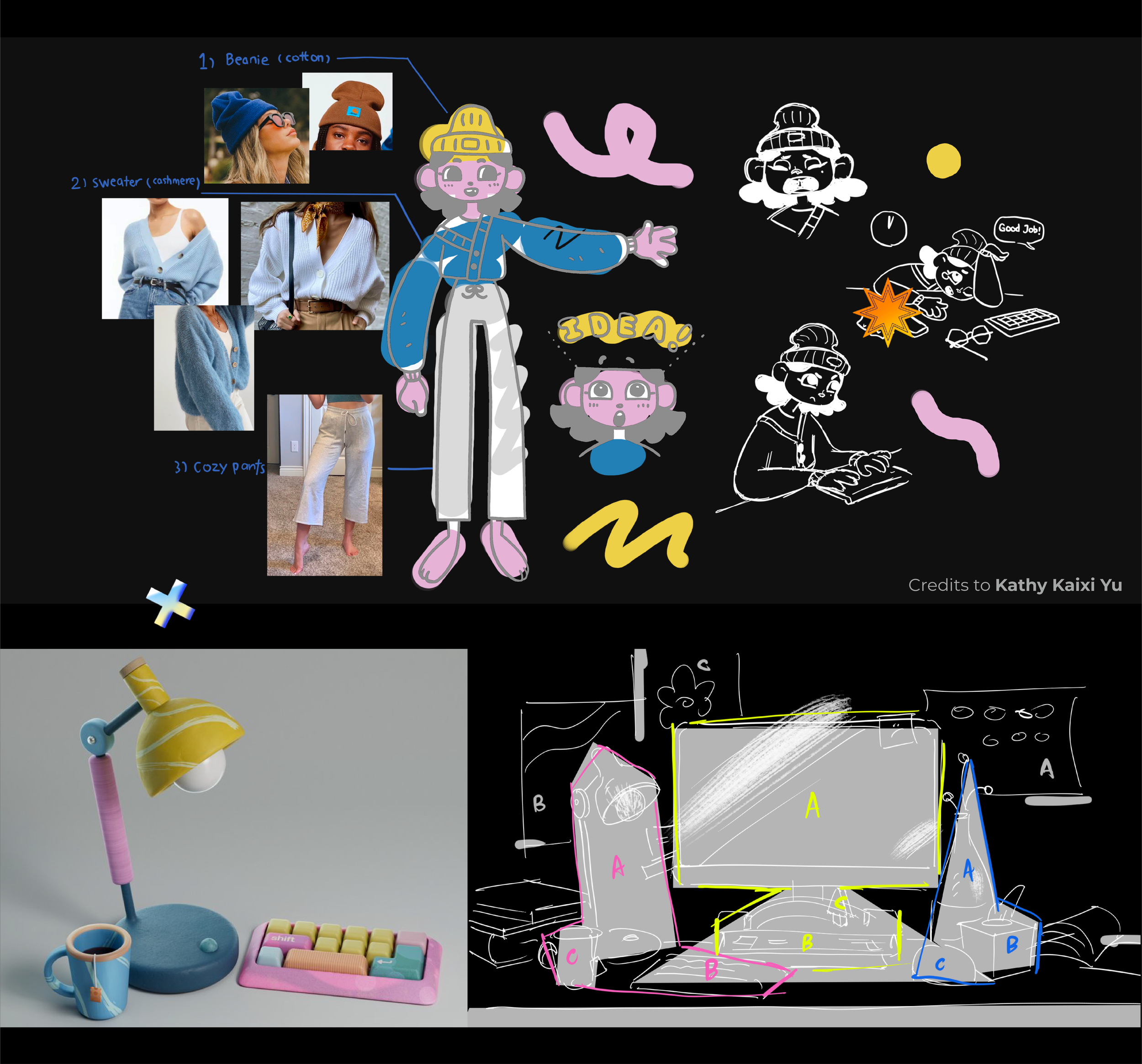 Our thesis girl is a freelance motion designer who has a lot of passion for work but also suffers from tight deadlines. She has a cute puffy face, a nice knitted hat, and a comfortable outfit.